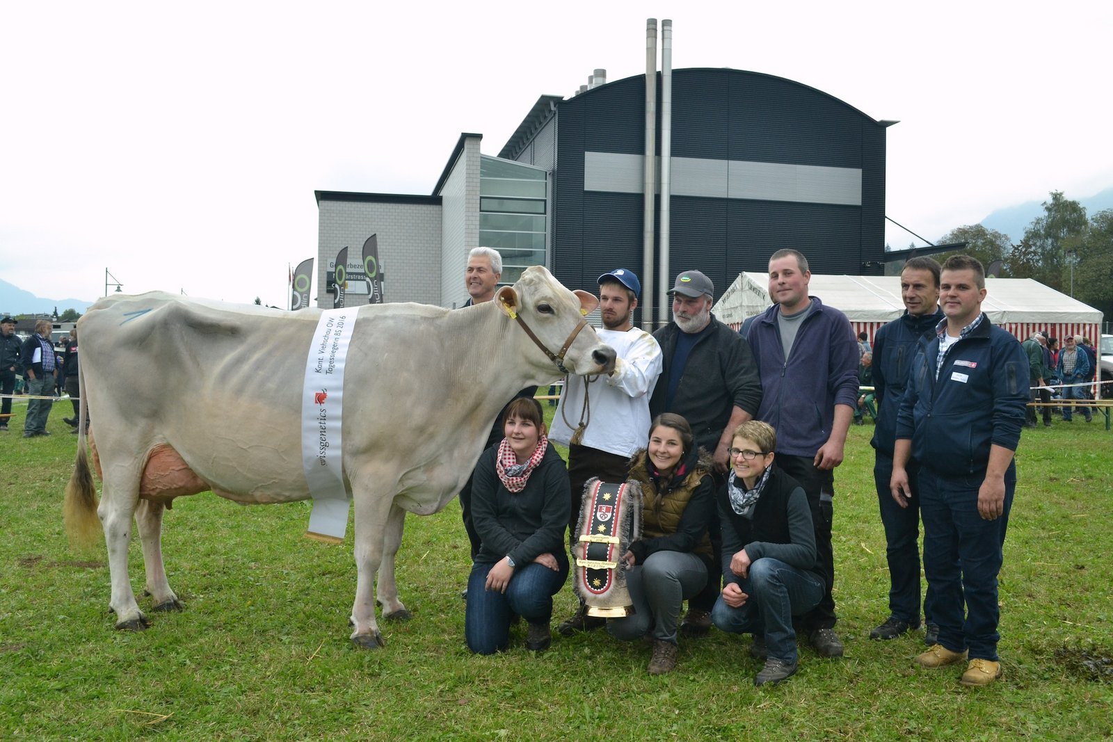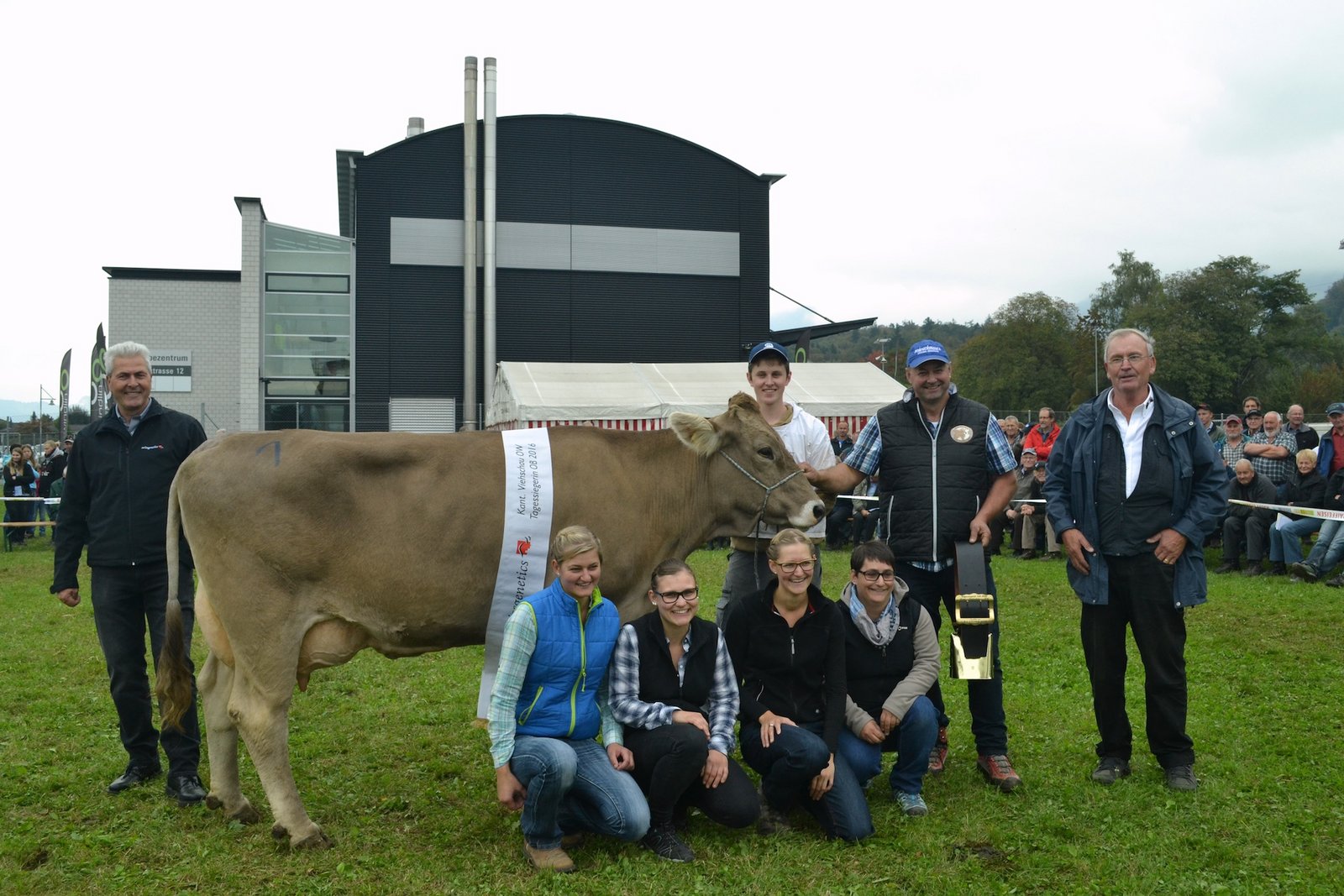 Am Nachmittag standen die Miss- und Misterwahlen, Schöneuter- sowie Genetikpreise auf dem Programm. Zum Mister kürte der Experte Markus Kennel den Stier Carlo von Paul Rohrer, Sachseln. Florian Pfulg fiel die Aufgabe zu, aus den vorselektionierten Erstmelkkühen die Siegerin im Schöneuterwettbewerb zu bestimmen. Sein Entscheid fiel auf Fabiola, eine Fantastic-Tochter von Hansueli Ming-Durrer, Lungern. Bei der mittleren Kategorie holte diesen Titel Zoldi, eine Zaster-Tochter aus dem Betrieb Halter’s BS, Lungern. Schöneutersiegerin der älteren Kühe wurde Jongleur Europa von Paul Reinhard, St. Niklausen. Rindertagessiegerin OB wurde Heiko Helga von Sepp Schäli, Giswil, und die Auszeichnung Rindertagessiegerin BV konnte Astro Daniela von Toni Ettlin, Kerns, für sich beanspruchen. Die Wahl der Tagessiegerin Original Braunvieh hatte der Experte Tres Anderegg vorzunehmen. Er gab dabei Melino Meisi von Thomas Schrackmann, Sarnen, den Vorzug. Diese hatte zuvor bereits den Schöneuterpreis der Kühe in dritter Laktation errungen. Die von Enrico Bachmann ernannte Tagessiegerin, Jongleur Europa von Paul Reinhard, St. Niklausen, hat bereits ein eindrückliches Palmares vorzuweisen. Die Kantonalschau hatte sie bereits als Rind gewonnen, darauf folgten in den letzten Jahren diverse Abteilungssiege und Schöneutertitel. National brillieren konnte sie 2015 anlässlich der Swiss Classic.