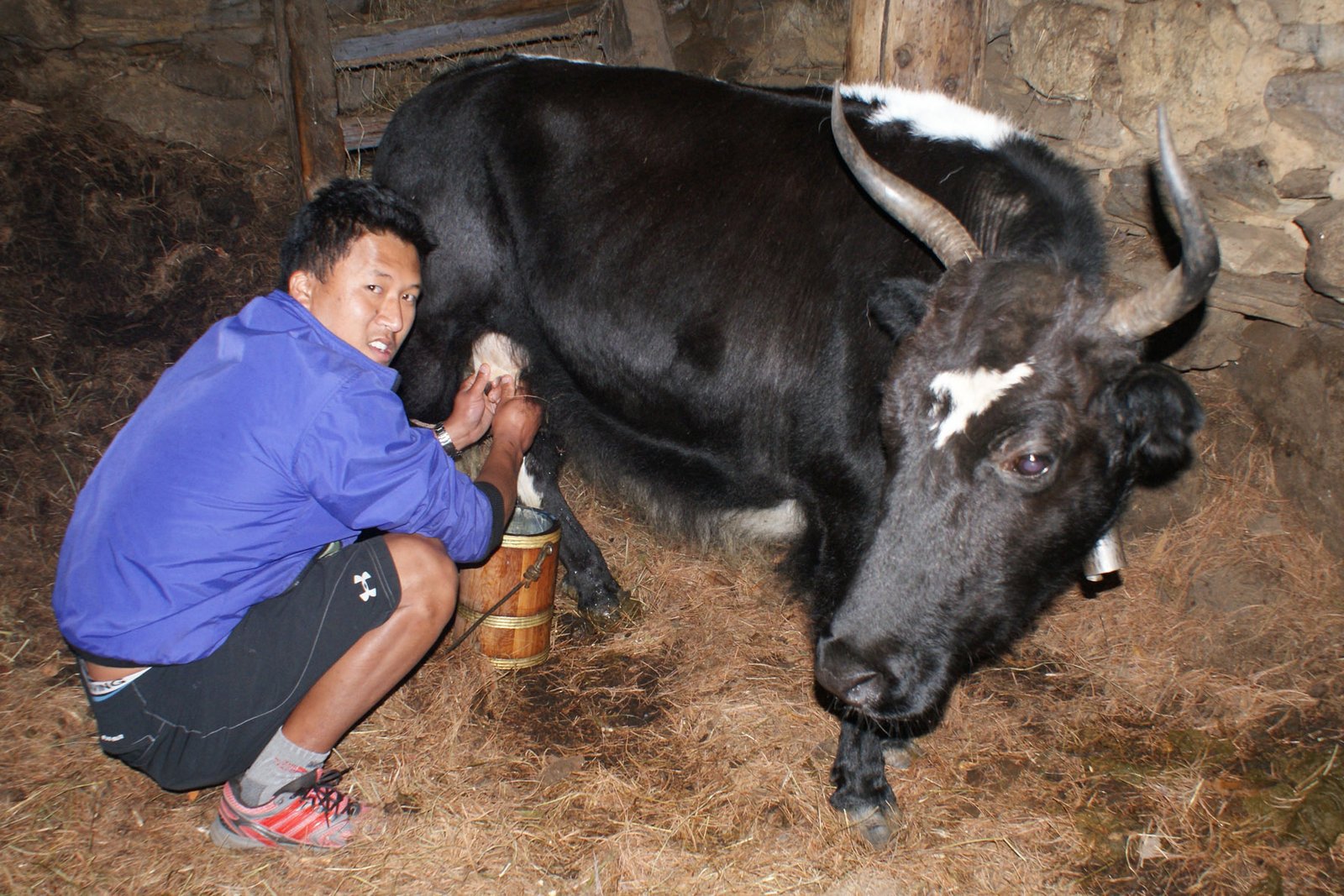 Familie Sherpa hält auch zwei Kühe, Yak-Mischungen, für die Versorgung mit eigener Milch. Zudem liefern die Kühe Dünger für die Ackerkulturen. Eigentlich verbilligt der Staat Saatgut und Düngemittel; eine termingerechte Versorgung, insbesondere in entlegene Regionen, mehrere Tagesmärsche entfernt von der nächsten Strasse, gibt es aber praktisch nicht.