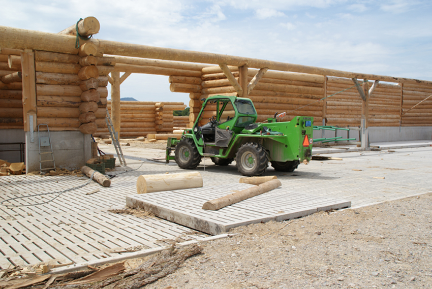 "Es macht Megaspass zu bauen", sagt Daniel Maag auf dem Biohof Wiesengrund in Oberglatt ZH. Er ist dabei, einen grossen Stall aus Rundholz zu bauen. Neben dem Stall liegt eine Vielzahl geschälter Baumstämme. "Wir haben eine grosse Auswahl", sagt der Landwirt. Nichts ist normiert oder vorgefertigt; die Stämme müssen zusammenpassen oder man muss sie durch geschicktes Fräsen anpassen. Auch wenn die Zimmermannsarbeit Spass macht, so ist sie doch eine Herausforderung für den Landwirt, der zwar einen eigenen Wald besitzt, aber nicht Zimmermann gelernt hat. Er baut den Stall zusammen mit Freunden, einem Angestellten und anderen Personen, die er auf dem Hof betreut.