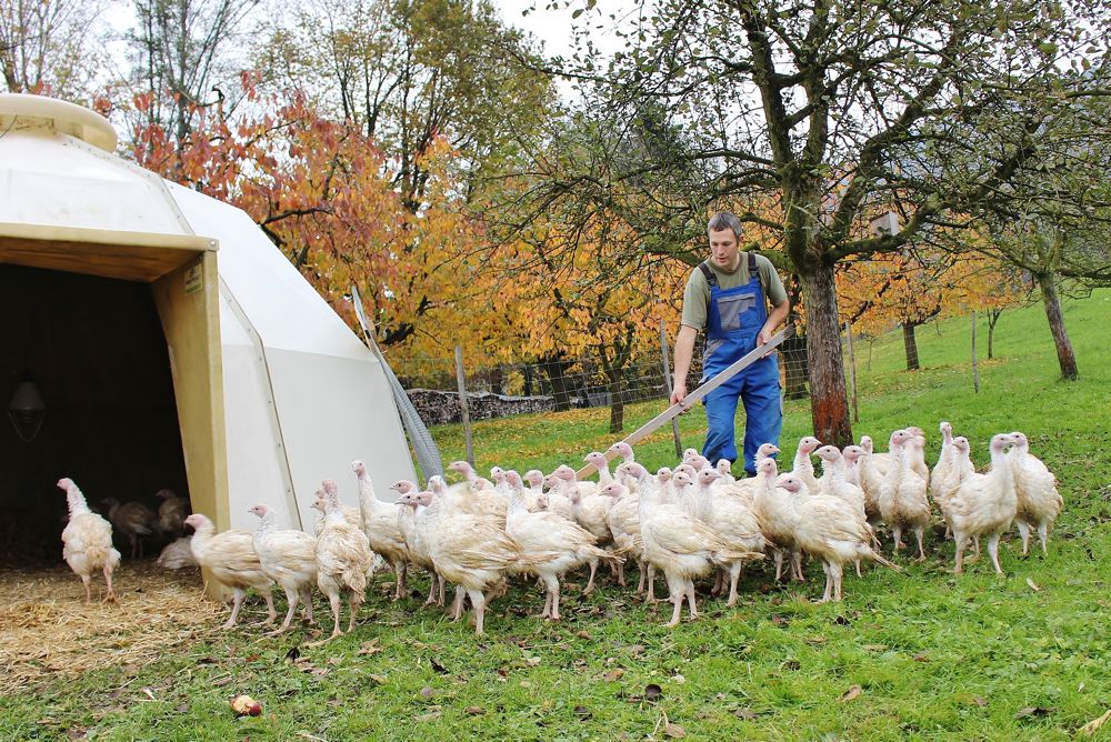 Wieder stellte sich für Muheims die Frage, ob sich die Trutenmast weiterhin lohnen würde. Wie sollten die Tiere künftig untergebracht werden? Auch für die Schlachtung auf dem Hof waren grössere Investitionen nötig. Doch Lösungen fanden sich: Heute übernachten die Hühnervögel in Polyester-Iglus, die im untersten Bereich windsicher in den Boden eingegraben sind. Als das Wohnhaus ausgebaut wurde, liess sich ein Schlachtraum integrieren.