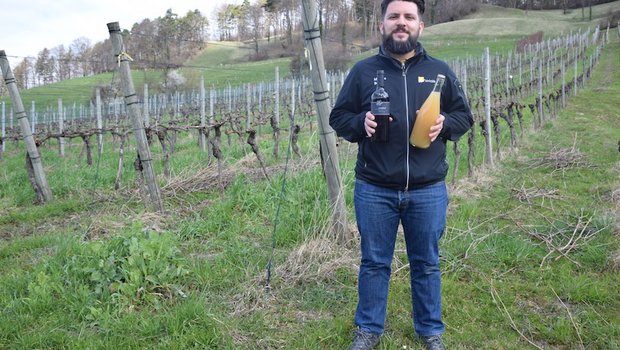 «Orange Wine» ist Wein, der ohne Zusatzstoffe in grossen Tongefässen nach urtümlicher, georgischer Art hergestellt wird. Deshalb wird er auch Kvevri genannt, gleich wie die Tongefässe, in denen er vergoren wird. Natürlich und schonend «Wir haben bereits 2013 Orange Wine hergestellt. Wir nehmen dafür Trauben vom Riesling-Sylvaner», erklärt Michele Bono. Orange wird der Wein durch die Vergärung samt Haut und Rappen…