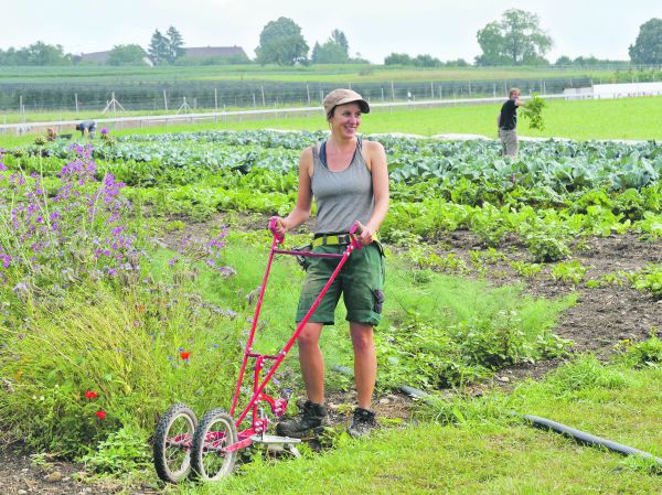 «Möchtest du lieber Kohl hacken oder Rüebli jäten?», fragt die angehende Gemüsegärtnerin Rahel Fuchs einen Helfer. An diesem heissen Samstagmorgen haben sich nebst ihr und Praktikantin Patricia Schwitter drei Genossenschafts-Mitglieder für die Arbeit auf dem 0,8 Hektar grossen Acker gemeldet. Nebenan rauscht die Autobahn und etwas weiter hinten starten die Flugzeuge in den blauen Himmel. Davon lässt sich die 32-Jährige nicht beirren. Das Gemüse, das hier gedeiht, wird nach biologischen Kriterien gezüchtet, angebaut, geerntet und per Velo transportiert.