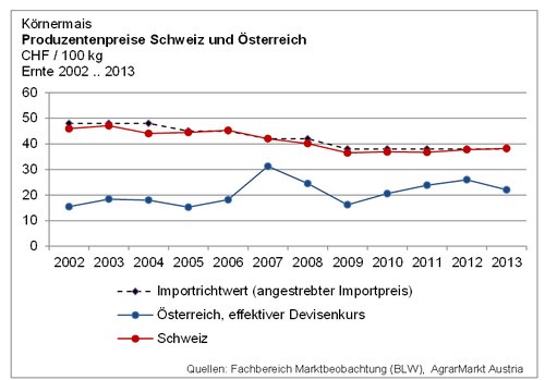 In Österreich hingegen stiegen die Preise an. Betrug die Preisdifferenz zwischen 2002 und 2006 noch zwischen 26 und 31 Franken pro 100 Kilo Körnermais waren es von 2007 bis 2014 nur noch zwischen 11 und 20 Franken. Durch das höhere Preisniveau im Ausland habe die Konkurrenzfähigkeit der Schweizer Produzenten zugenommen, so das BLW.