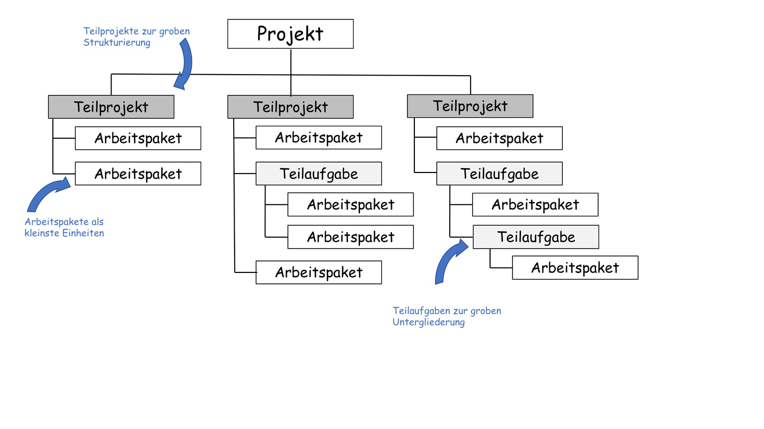 Damit der Überblick nicht verloren geht, kann man einen Projektstrukturplan erstellen. Dieser verknüpft die verschiedenen Arbeitspakete und Tätigkeiten in ihrer logischen Folge. Dabei werden Abhängigkeiten zwischen den einzelnen Arbeitseinheiten sichtbar. Und damit auch der kritische Pfad. Jene Anordnung der einzelnen Projektschritte, die für Dauer und Kosten entscheidend ist.