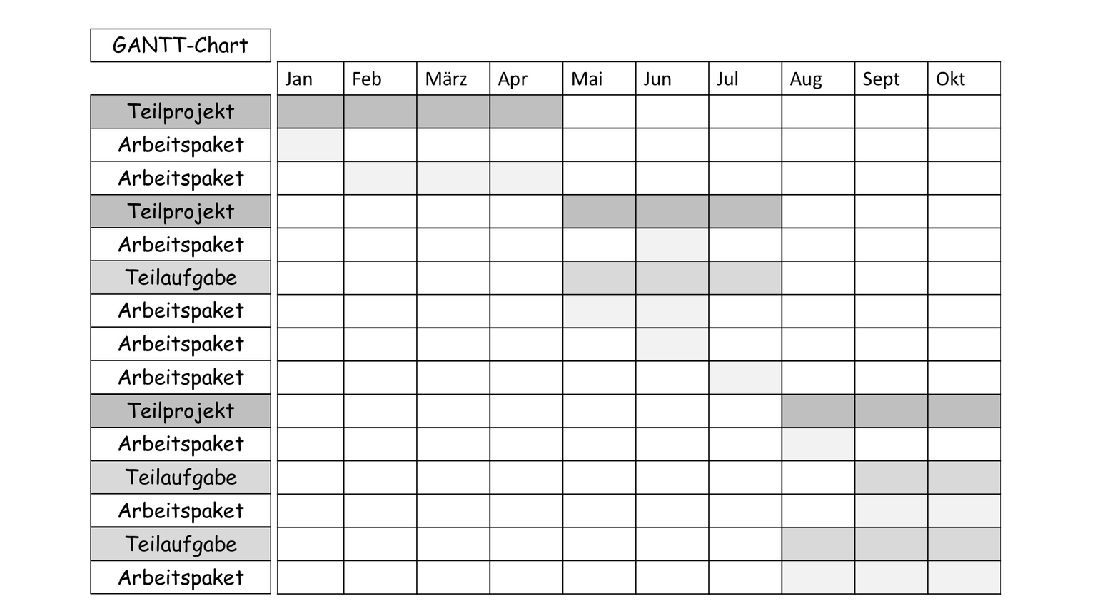 Wird der Projektstrukturplan mit der Terminplanung verbunden und grafisch dargestellt, erhält man das bekannte wie nützliche Gantt-Diagramm. Dieses zeigt auf einen Blick, wer wann wo was zu erledigen hat und wie viel Zeit dazu zur Verfügung steht.
