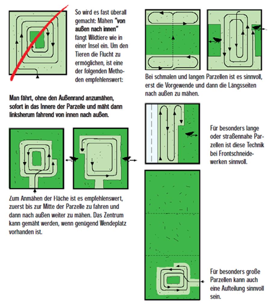 - Richtiges Mähen: Von innen nach aussen, von der Strasse weg und zu Waldrändern hin mähen, damit die Fluchtwege für Tiere offen bleiben (siehe Bild).