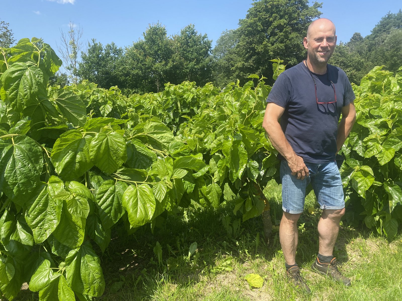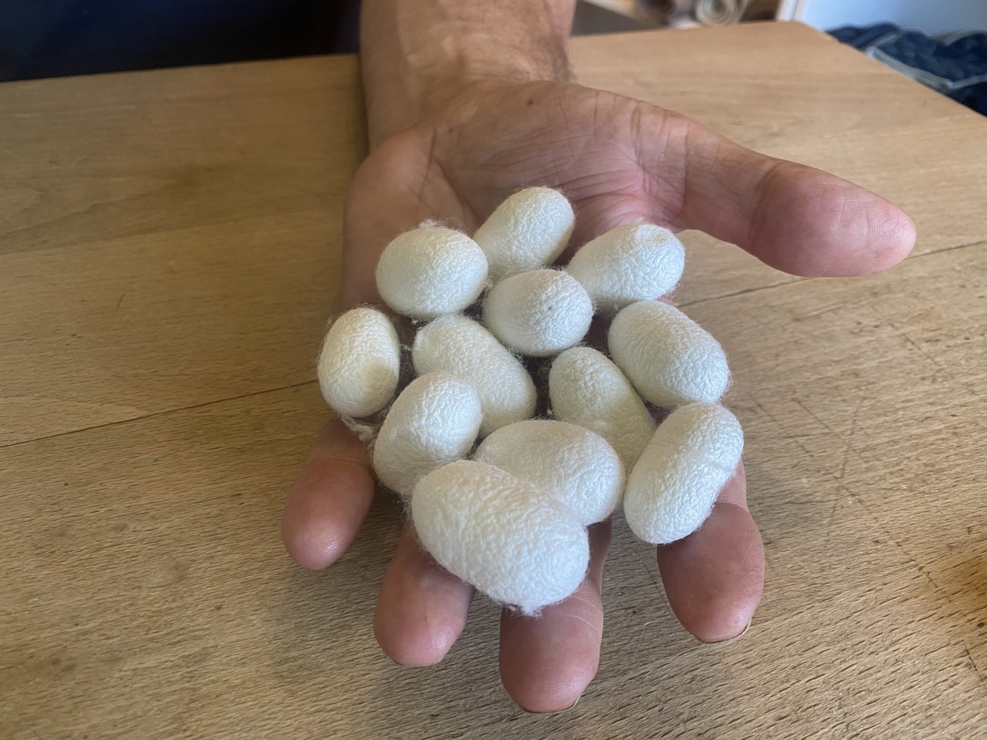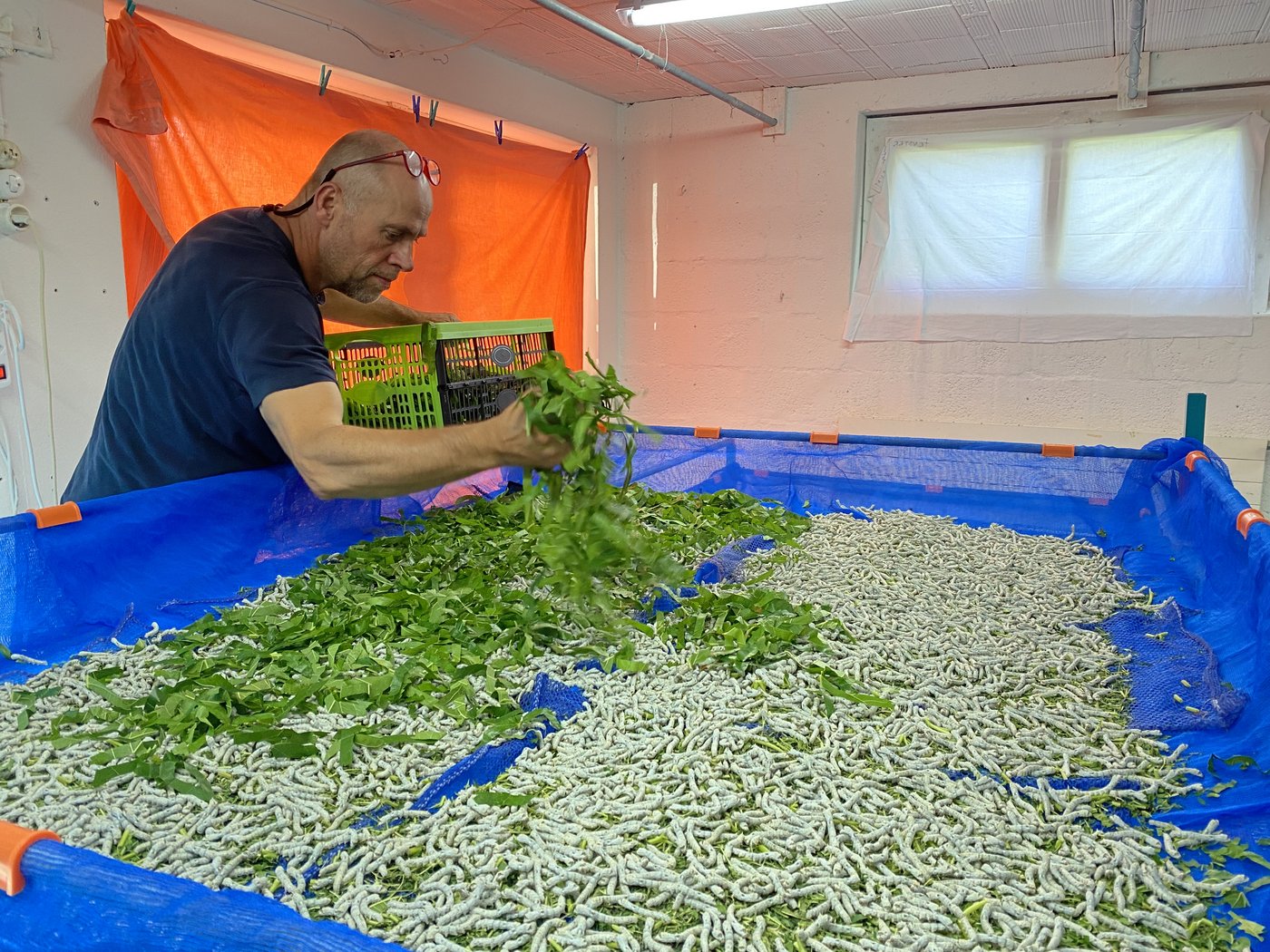 Bei Ueli Ramseier und Bettina Clavadetscher raschelt es in der umfunktionierten Garage in Hinterkappelen im Kanton Bern. Es ist nicht etwa ein Motor, der ungewohnte Geräusche von sich gibt, sondern 15 000 Seidenraupen, die sich an frischen Maulbeerblättern vergnügen. Die auf dem Bild 15 Tage alten gräulichen Raupen ernähren sich ausschliesslich von den Blättern der weissen Maulbeere (Morus alba) und…