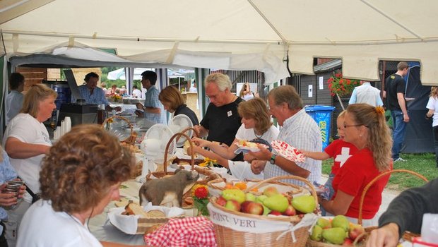 «Wir dürfen jedes Jahr auf eine grosse Anzahl freiwilliger Helfer zählen», freut sich Agnes Zuber. Am 1. August stehen ab dem frühen Morgen rund drei Dutzend Helfer im Einsatz, die sich um das Wohl der Gäste kümmern. Liebevoll werden die vielen Platten nachgefüllt: mit Käse, Fleisch, verschiedenen Backwaren und vielen anderen Köstlichkeiten. Wohl bilden sich entlang der Buffets Schlangen, doch niemand muss lange warten, bis er wieder an der Reihe ist, um sich kulinarisch verwöhnen zu lassen.