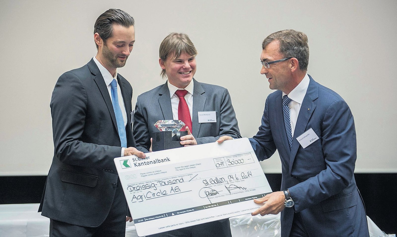 Das überzeugte die Jury mit Unternehmern, Vertreter der St. Galler Kantonalbank, IHK-Direktor und Stadtpräsident. «Das Marktpotenzial von Agricircle ist gewaltig», sagte Roland Ledergerber, Chef der SGKB, als er gestern abend am Hauptsitz der Bank CEO Peter Fröhlich und Informatiker Daniel Markward den Haupt-«Diamant» und 30 000 Franken überreichte.