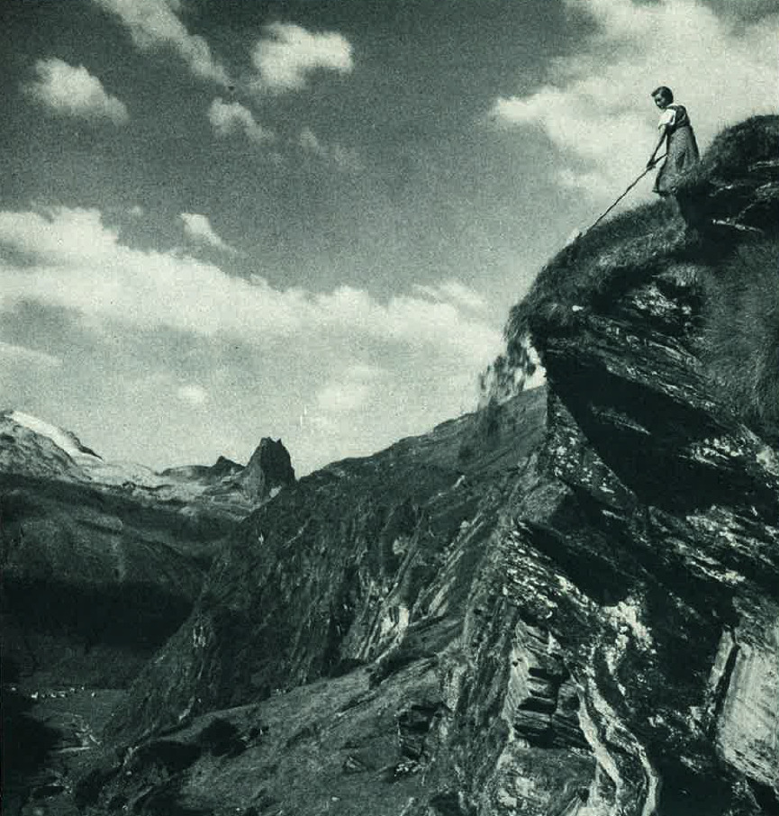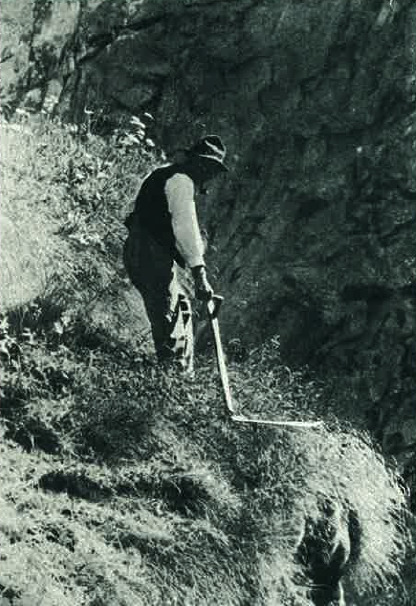 Im Gegensatz dazu wird auf den höher gelegenen Landwirtschaftsbetrieben heute wie früher viel Handarbeit verrichtet: "An den steilen Halden unserer hohen Alpen gewinnt der Älpler das Wildheu. Selbst Frauen und Töchter schwingen noch die Sense, allerdings in den Bergen häufiger als im Tal."
