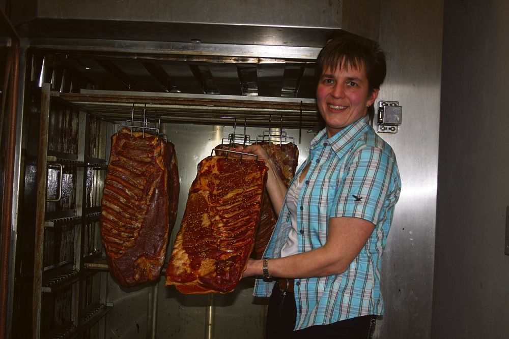 Beim Ehepaar Speck-Schlauri legen beide tatkräftig Hand an. Das bedeutet beispielsweise, dass Claudia Speck im Heimbetrieb melkt, während ihr Mann im zweiten Betrieb das Vieh versorgt. Seit sieben Jahren hat sich Claudia Speck noch einen anderen Betriebszweig aufgebaut: sie räuchert Speck und Mostbröckli und stellt Schwartenmagen her. «Bei meiner Schwartenmagen hat es Ware drin, nicht nur Sulz», versichert Claudia Speck.