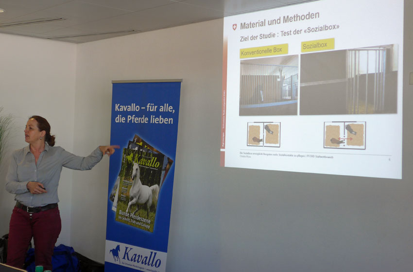 Immerhin sind hier in den letzten Jahren Fortschritte gemacht worden. Christa Wyss vom Nationalgestüt in Avenches stellte Ergebnisse einer Forschungsarbeit mit sogenannten Sozialboxen vor. Diese sind so gebaut, dass die Pferde in jeweils zwei nebeneinanderliegenden Einzelboxen durch weit geöffnete Gitterstäbe sozial interagieren können und zwar mit Körperkontakt, was in konventionellen Boxen mit engen Gitterstäben nicht möglich ist. Diese verstärkten Begegnungsmöglichkeiten haben die Hengste in Avenches ausführlich genutzt, wie Wyss erklärte.