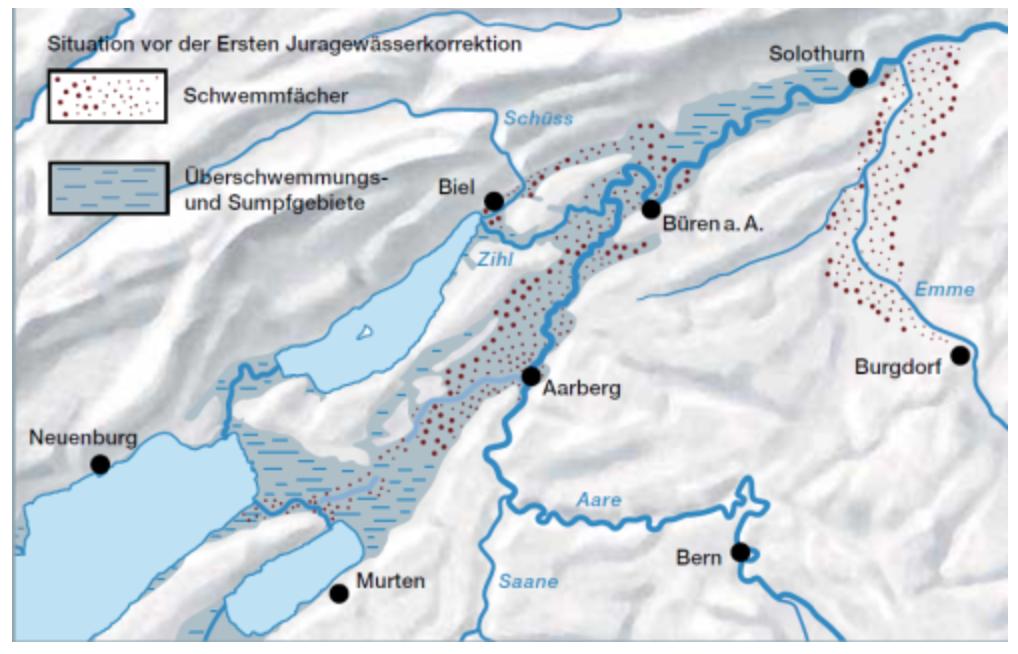 - Korrektion der oberen Zihl zwischen Neuenburger- und Bielersee durch den neuen Zihlkanal.
