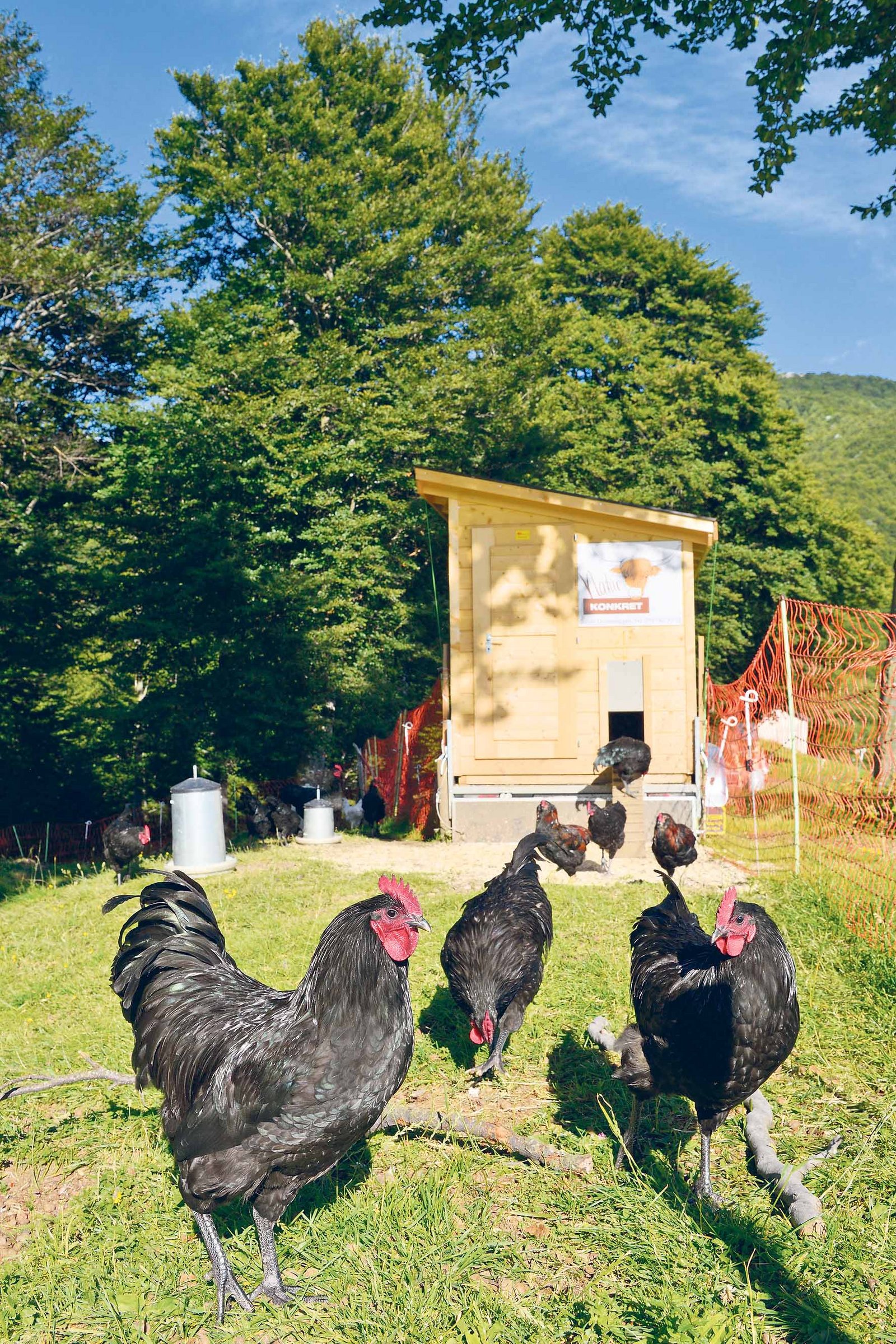 Die Wiesengüggeli – in der Bergzone heissen sie Berggüggeli und auf Tessiner Alpen Alpgüggeli – sind das jüngste Kind in Guido Leuteneggers Aktivitäten. Eingestiegen in die Hühnermast ist Guido Leutenegger vor anderthalb Jahren. Er hält seine Güggeli in Gruppen von 80 Tieren in mobilen Ställen, was eine Schonung der Grasnarbe ermöglicht. Inzwischen sind 80 solcher Ställe bei verschiedenen Partnern von Leutenegger auf Achse. Die Tiere haben ständig Auslauf auf einer Wiese und werden mit einer 100-prozentigen Biokörnermischung gefüttert. Leutenegger verzichtet auf die gängigen Mastrassen und setzt stattdessen in Zusammenarbeit mit Pro Specie Rara auf alte Rassen.