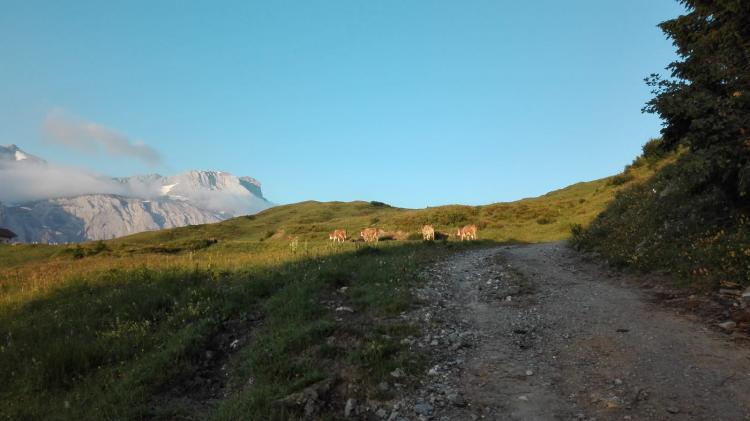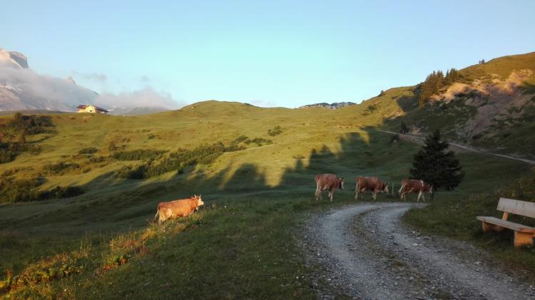 Der Tag beginnt bei uns um 5 Uhr. Raphael trägt die Käselaibe vom Vortag ins Salzbad und macht das Melkzeug bereit. Ich heize den Tiba-Herd ein. Mit Holz heizen wir das Wasser im Boiler. So verfügen wir immer über genug warmes Wasser für die Käserei, für die Küche, zum Heizen und Duschen. Nach einem gemeinsamen Kaffee bin ich bereit, die Kühe zu holen. Rocky wartet schon ganz ungeduldig auf seine Arbeit. Das Küheholen ist eine meiner Lieblingsaufgaben auf der Alp - aber zugleich manchmal auch die anstrengendste, wenn die Tiere andere Pläne als das Heimspazieren haben. Morgensport ist es auf jeden Fall.