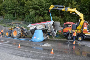 Am Freitagmorgen gegen 7.20 Uhr fuhr der Lenker eines Traktors mit Tankanhänger über die Äussere Klus von Oensingen in Richtung Balsthal. Beim Links-Abbiegen in die Solothurnerstrasse verlor er die Kontrolle über sein Fahrzeug, wie die Kantonspolizei Soloturn mitteilt. In der Folge kippte der mit Wasser gefüllte Anhänger auf die Fahrbahn.