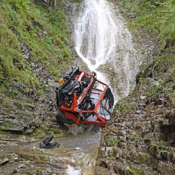 Das Trägerfahrzeug wurde durch die verbleibenden Befestigungspunkte mitgerissen und stürzte rund 100 Meter in den Dundelbach hinunter. Dabei starben am 14. September ein 27-jähriger Landwirt und seine 17-jährige Lehrtochter. Eine der fünf Kühe überlebte den Absturz.