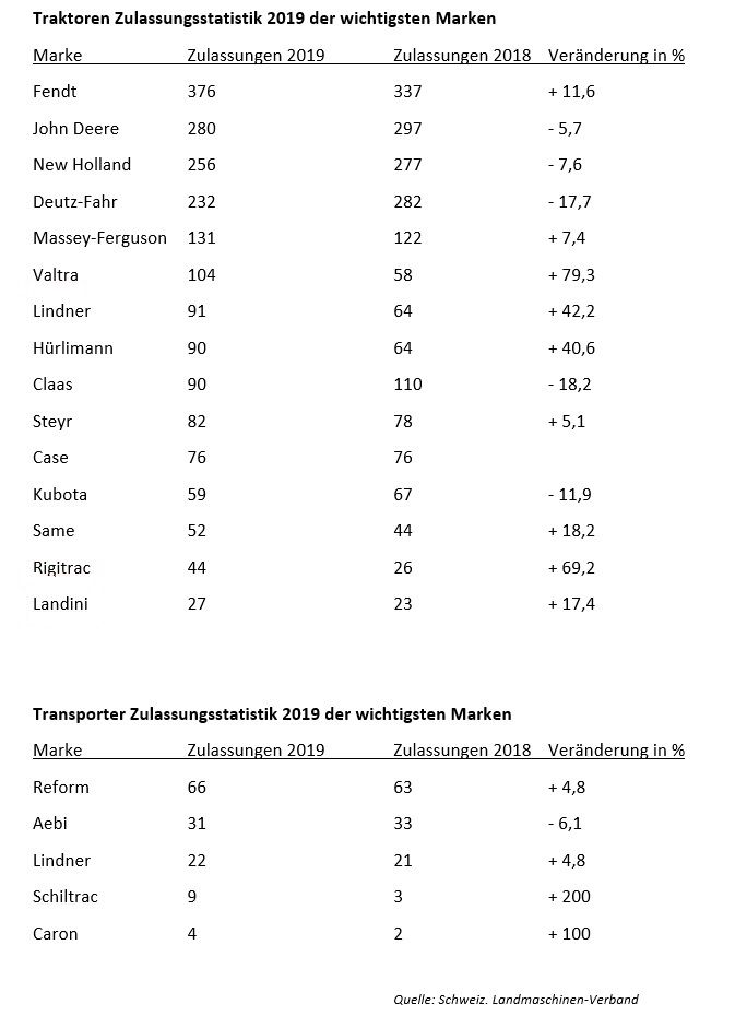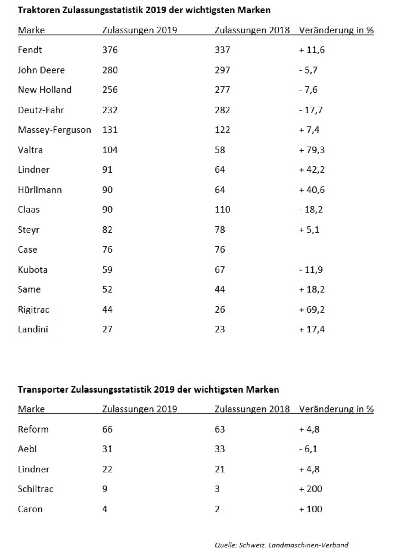 Die Traktorzulassungen stiegen um 4 Prozent auf 2026 Stück, im Vorjahr waren es 1948 Traktoren, die neu in Verkehr gesetzt wurden. Bei den Transportern betrug die Zunahme sogar 8,2 Prozent, allerdings auf zahlenmässig deutlich tieferem Niveau. Die Verkäufe stiegen gegenüber 2018 um 10 auf 132 Stück. Einzig bei den Zweiachsmähern gab es einen leichten Rückgang. Diese verloren 3,2 Prozent. 2019 wurden 241 Stück verkauft, im Jahr zuvor waren es noch 249.