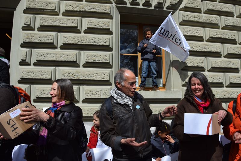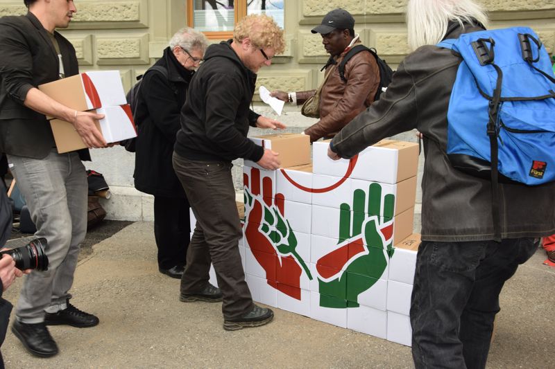 «Wo ist der Kanton Schaffhausen?», fragt jemand auf Französisch. Kartonschachteln werden umgeschichtet, ein Bauplan studiert. Es dauert eine Weile, bis das Puzzle - bestehend aus den Schachteln voller Unterschriften - zusammengesetzt ist. Am Schluss entsteht daraus das Logo der Initiative für Ernährungssouveränität. Mit dem Puzzle und einem farbenfrohen Umzug mit vielen Fahnen und Transparenten übergibt die Bauerngewerkschaft Uniterre am Mittwochnachmittag die Unterschriften für ihr Volksbegehren der Bundeskanzlei.