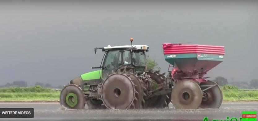 Haben Sie einen solchen Traktor schon einmal gesehen? Es handelt sich um einen Deutz-Fahr Agrotron K610 mit einem Düngerstreuer Sulky DPX Magnum 44, beides auf Eisenrädern. Mit dieser Kombination wird Reis in der norditalienischen Gemeinde Vespolate in der Provinz Novara (Piemont) gesät.
