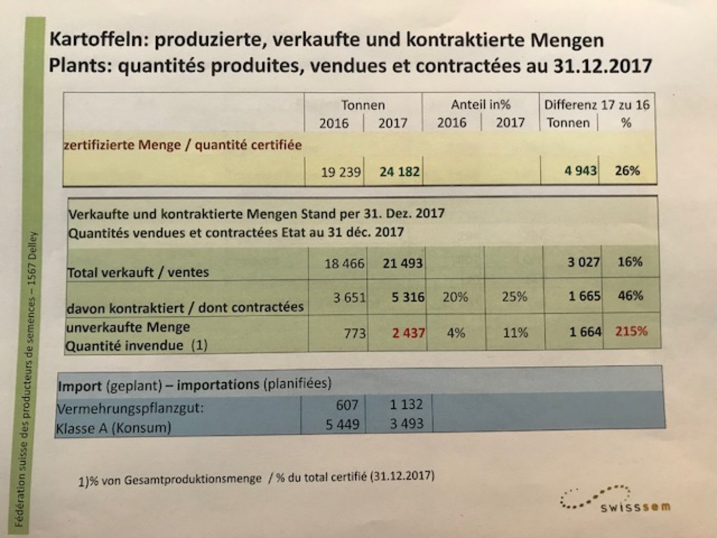 Eine starke Produktionszunahme war auch bei den Saatkartoffeln zu verzeichnen. Die zertifizierte Menge legte um nicht weniger als 26% auf 24'182t zu. Allerdings nahm damit auch die unverkaufte Menge deutlich zu. Sie verdreifachte sich gegenüber dem Vorjahr auf 2437t. Gleichzeitig, und das schmerzt die Produzenten, verdoppelte sich der Import von Vermehrungssaatgut auf 1132t.