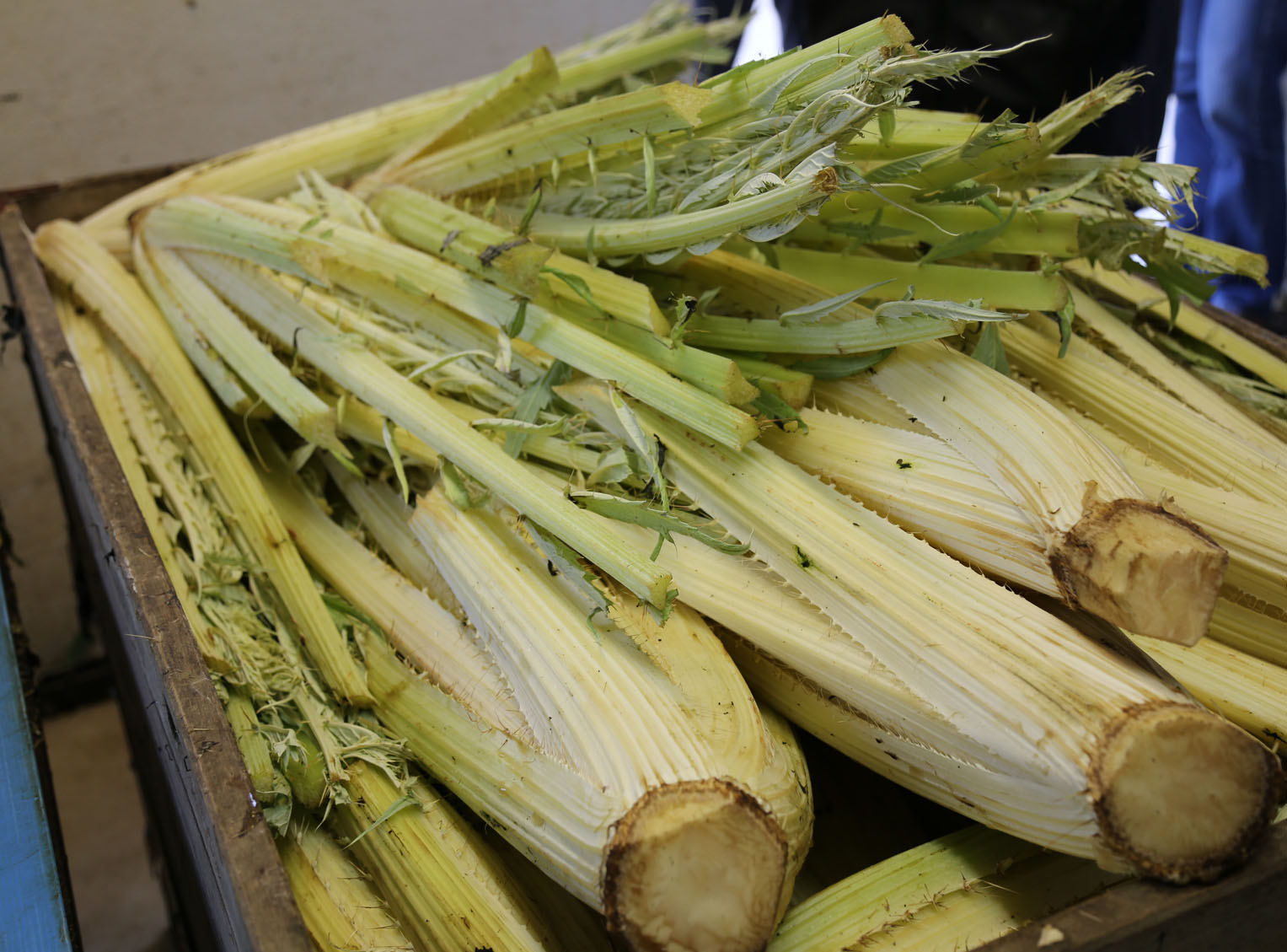Die Aussaat erfolgt im März. Im November beginnt das "Bleichen": Jede Pflanze wird einzeln von einem schwarzen Plastik umhüllt, damit kein Sonnenlicht an die Pflanze gerät. Die Photosynthese wird partiell verhindert, die Pflanze wächst weiter. Die ehemals grünen Blattstiele werden heller, fast weiss. Sie werden zarter, weniger faserig, nicht so bitter und nussig im Geschmack.