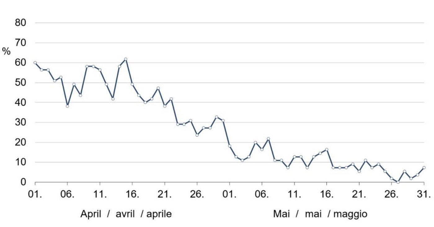 Häufigkeit von Bodenfrost im April und Mai zwischen 1965 und 2019, analysiert für die Messreihe Payerne (490 m ü. M.). (Grafik Meteo Schweiz)
