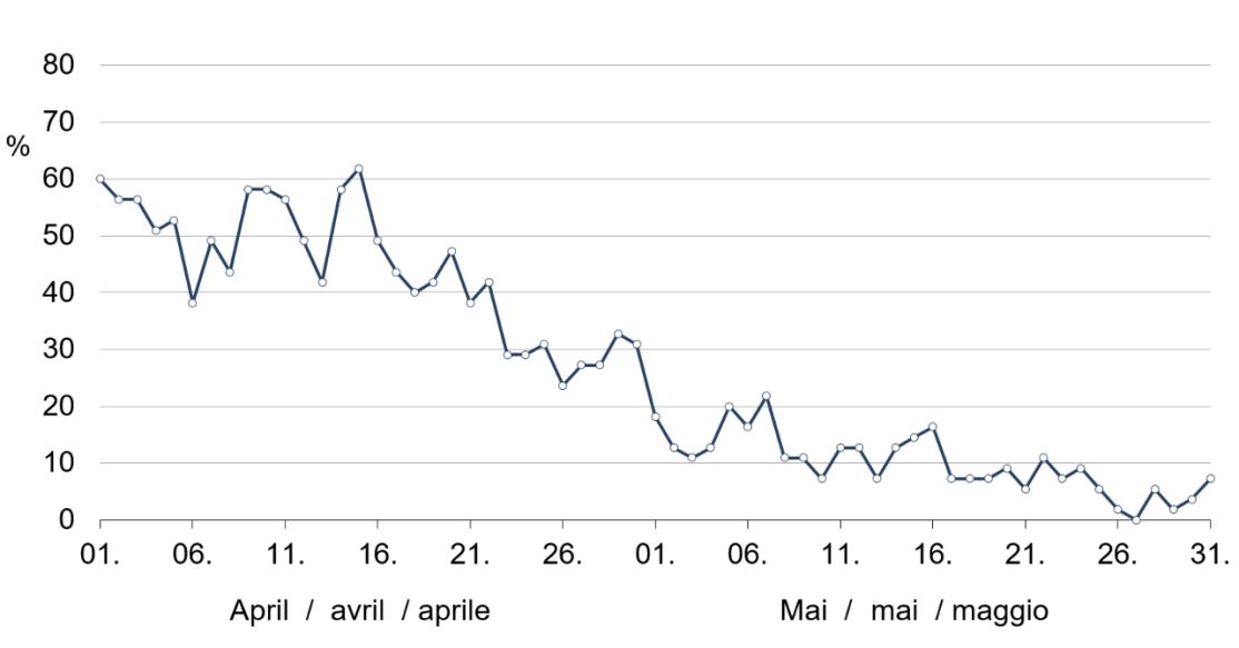 Die längste Aufzeichnung der Temperatur direkt über dem Boden für die Schweiz geht bis ins Jahr 1965 zurück und wurde in Payerne VD erstellt. Regelmässiger Bodenfrost gibt es diesen Zahlen zufolge nur bis Mitte April. Vom 1. bis 25. Mai beträgt die Wahrscheinlichkeit dafür noch etwa 10 Prozent.