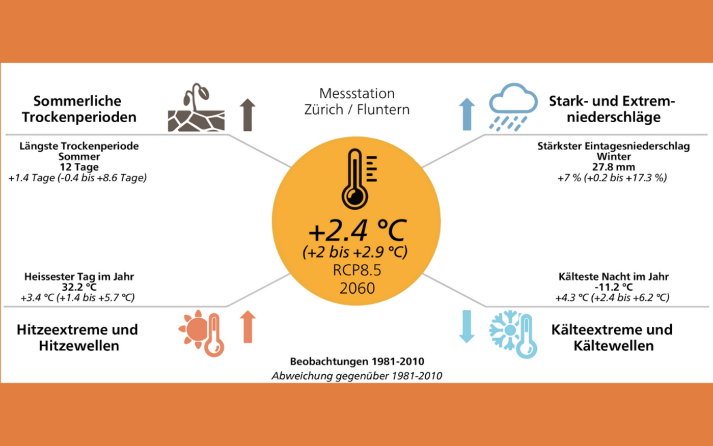 Was die Temperatur der Zukunft angeht, ist meist von Durchschnittswerten die Rede. Dies auch auf globaler Ebene, wo das Pariser Abkommen die Erderhitzung auf durchschnittlich 1,5 Grad begrenzen will. Weitaus heftiger klettern aber die Höchsttemperaturen, schreibt das NCCS: An heissen Sommertagen werde es 2 bis 5,5 Grad wärmer als heute – 40 Grad sind somit nicht mehr weit entfernt. In den Kantonen Genf, Tessin und Zürich sollen Hitzetage in tieferen Lagen bis 2060 ohne Klimaschutz drei- bis viermal häufiger werden.