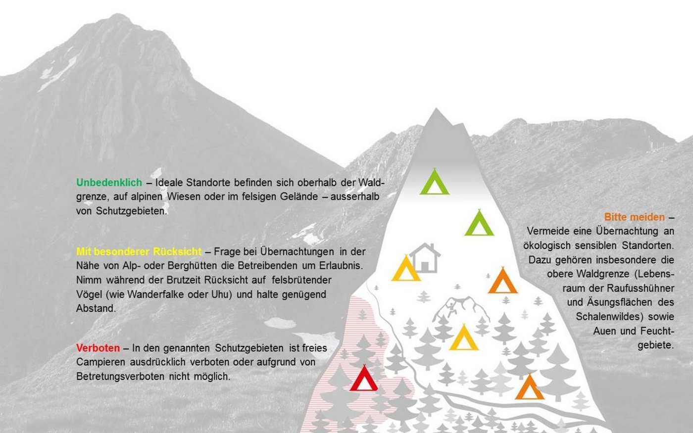 Die Kantone bzw. Gemeinden haben aber jeweils eigene rechtliche Bestimmungen. Es lohnt sich deshalb, sich vor jedem Ausflug bei der jeweiligen Gemeinde zu erkundigen, ob das freie Campieren dort möglich ist. Martin Künzle vom Schweizer-Alpenclub (SAC) betont zusätzlich, dass es wichtig ist, die Naturschutzgebiete auf kantonaler und kommunaler Ebene zu respektieren. Diese seien nicht, wie z.B. Jagdbanngebiete auf map.geo.admin.ch ersichtlich, aber meist vor Ort gut ausgeschildert. Die genaueren Informationen über die Schutzbestimmungen der einzelnen Naturschutzgebiete findet man auf den Geoportalen der Kantone.