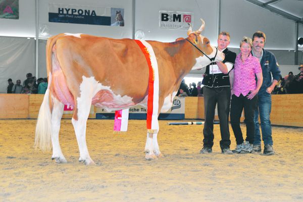 Sobald sie den Ring betritt, richten sich immer alle Augen auf sie: Die Rede ist von der wunderschönen Swiss Fleckviehkuh Bond Arnika der Familie Heidi und Ferdinand Bergmann aus Abländschen. Neben dem Schöneutersieg am Jungkuhchampionat in Thun, waren ihr SF-Titel an der VSA-Ausstellung und besonders der Rassensieg an der Bernischen Eliteschau 2017 ein grosses Highlight. «Ja, sie ist schon etwas Besonderes für uns», sagt Ferdinand Bergmann am Küchentisch. Die aus der Zucht von Hansueli Bütschi aus Eriswil stammende Arnika hat als trächtiges Rind den Weg nach Abländschen gefunden und seither der Züchterfamilie viel Freude bereitet und ihr schon zwei Kuhkälber von den Stieren Cocorossa und Tornado geschenkt. Mit ihrer Eleganz und dem tadellosen Euter verkörpert Arnika, die mit dem Maximum von 44 44 94 punktiert ist, das Zuchtziel der Swiss Fleckviehkuh auf eindrückliche Art und Weise.