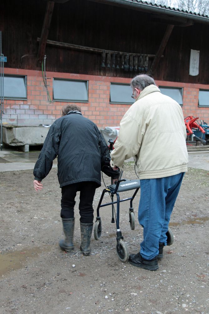 Jetzt ist Ernst schon lange Zeit zu Hause. Hier arbeitet und trainiert er hart – jetzt kann er mit seinem Rollator wieder gehen. Er schafft es tatsächlich, ein paar Kühen etwas Heu in die Krippe zu geben – so lange parkiert er den Rollator. Auf die Frage, ob ihr die Pflege nie zu viel werde, antwortet Therese: «Es ist schon nicht immer einfach. Wir haben einander versprochen, in guten und schlechten Tagen füreinander da zu sein. Das gilt für mich.» Es sei immer ein wunderbares Gefühl, wenn ihr Ernst danke sage und seine Dankbarkeit zeige.