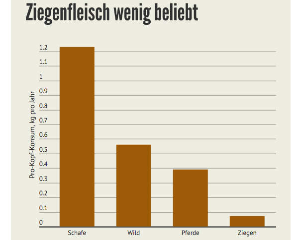 Damit die Milch fliesst, müssen Ziegen regelmässig Zicklein gebären. Oft sind es gleich zwei oder gar drei, die pro Geburt auf die Welt kommen. Und damit fängt für die Ziegenhalter das Problem an. Denn anders als Ziegenmilch wird Ziegenfleisch nur sehr wenig konsumiert. Auf gerade mal 70 Gramm belief sich der Pro-Kopf-Konsum im letzten Jahr. Zum Vergleich: Beim Schaf sind es 1,23 kg, gesamthaft werden 51 kg Fleisch pro Kopf und Jahr gegessen.