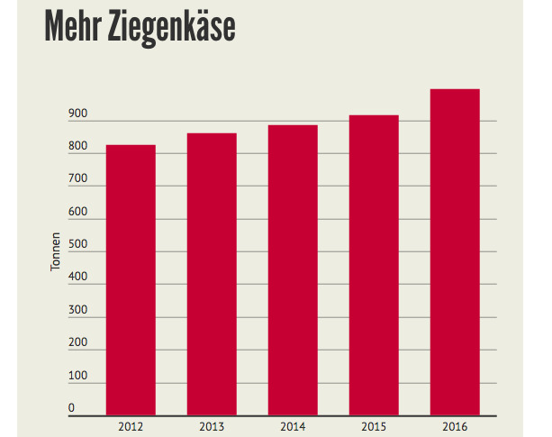 Die Bauern haben aufgrund der steigenden Nachfrage die Produktion in den letzten Jahren ausgedehnt. 2016 haben sie rund 22'000 Tonnen gemolken – ein Drittel mehr als im Jahr 2000. Der Milchziegenbestand wuchs im gleichen Zeitraum um rund 5'300 auf letztjährig knapp 35'000 Tiere.