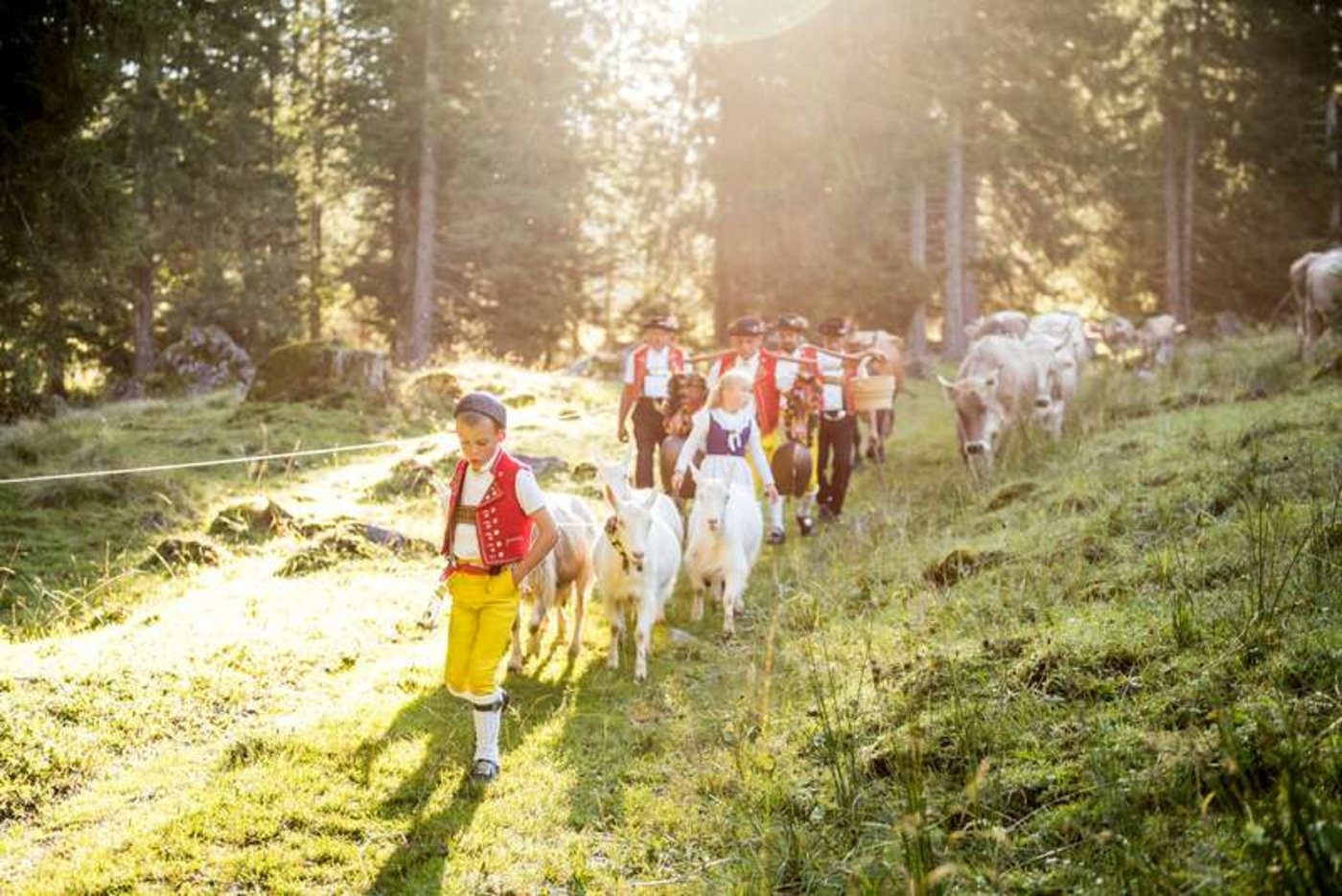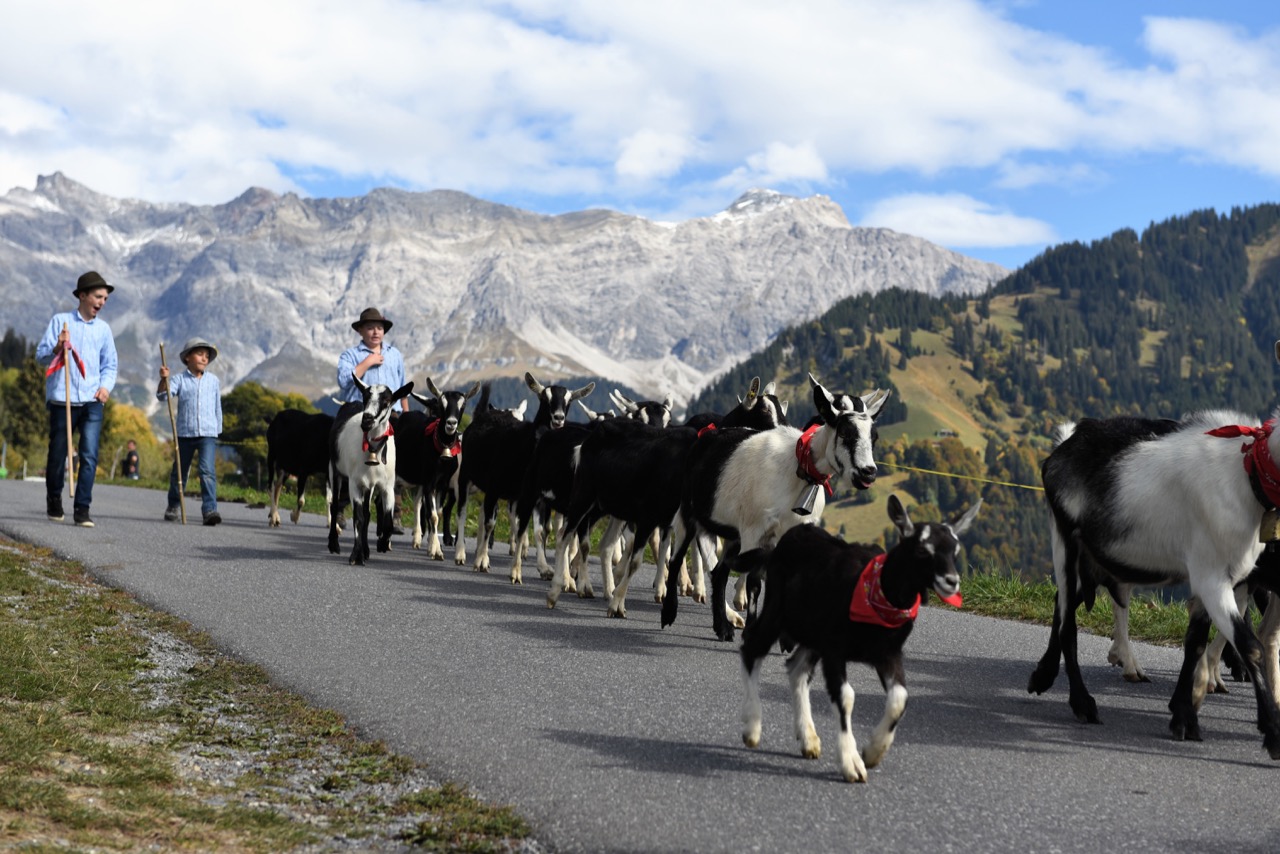Mitte September ziehen die Appenzeller Sennen mit ihrem Vieh wieder zurück ins Tal. In Urnäsch AR ist das am 14. September 2019 der Fall. Eine traditionelle Appenzeller Alpabfahrt hat immer folgende Choreografie: Ein Bub in der Sennentracht führt ein Rudel der weissen, hornlosen Appenzeller Ziegen an, die von einem Mädchen in der braun- oder blaugestreiften Werktagstracht getrieben werden. Dann tritt der Senn in der Volltracht auf. An der linken Schulter trägt er den reichgeschnitzten Fahreimer, einen Melkkübel aus Holz. Ihm folgen drei Kühe, die die schweren Senntumsschellen an kunstvoll verzierten Riemen tragen. Vier Bauern in der Tracht marschieren vor dem Rest der Herde. Den Abschluss des Zuges bilden die Pferdewagen mit den Alpgerätschaften und den Schweinen. In Urnäsch locken neben diesen wunderbaren Bildern auch das Älplerfest und ein grosser Bauernmarkt mit Streicheltieren und Musik. Alle Infos zum Alpabzug in Urnäsch.