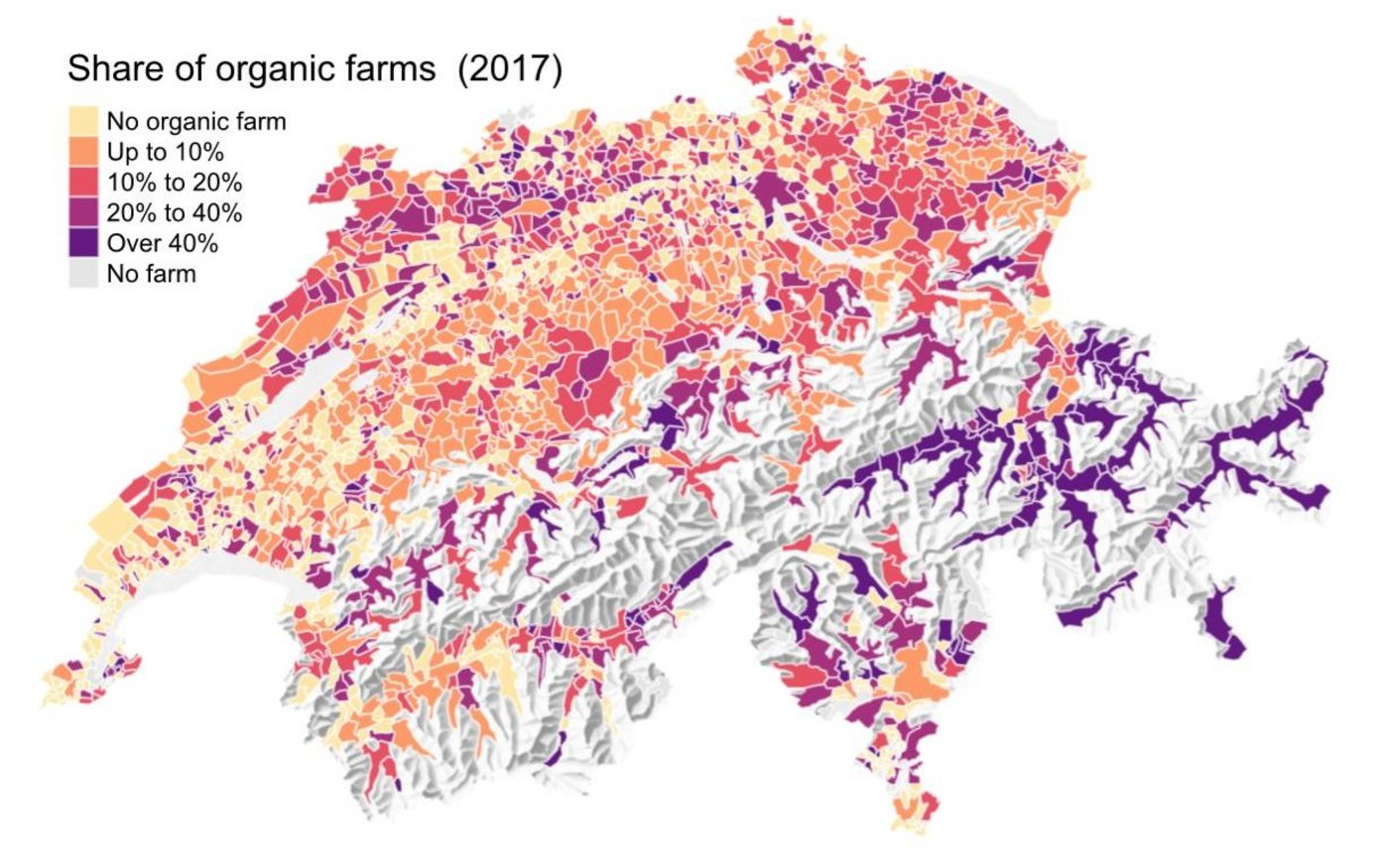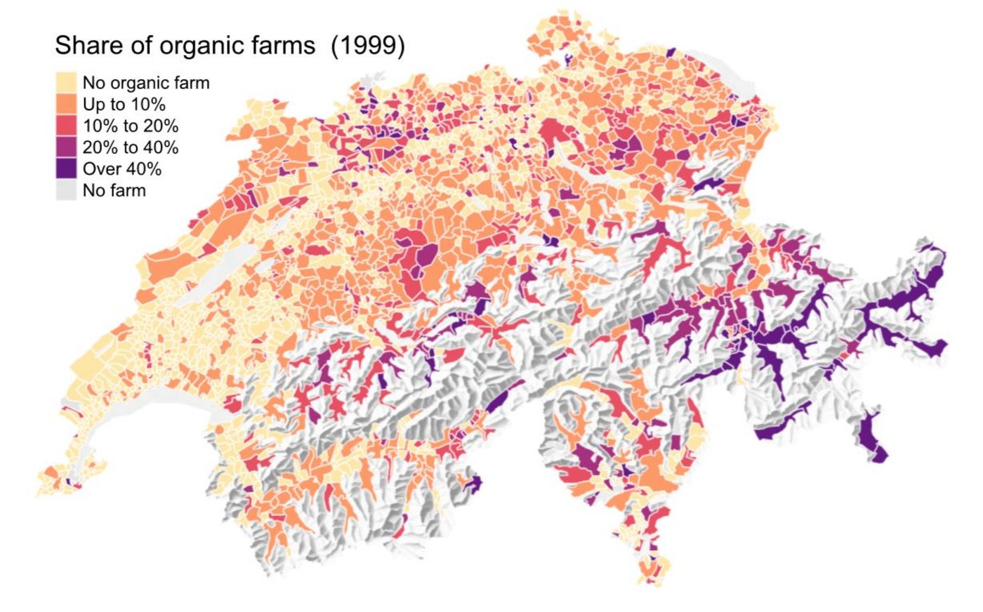 Zuerst konvertieren also Landwirtschaftsbetriebe in Regionen, in denen die Umstellung auf den ökologischen Landbau weniger Investitionen erfordert und daher weniger risikoreich ist. Chautems ergänzt: «Später wurden Betriebe mit komplexeren Produktionssystemen zuversichtlich genug, um die hohen Investitionen zu tätigen, die mit einer Umstellung verbunden sind.» Wenn vielfältigere Betriebe auch auf Bio umstellen, nimmt folglich die Rolle der Standortmerkmale ab. Früher waren berg- und stadtnahe Gebiete wichtige Brennpunkte für die Umstellung auf den ökologischen Landbau, doch heute weist auch das ländliche Tiefland eine ähnliche Umstellungsrate auf. Es trägt also nicht mehr zur Entscheidung bei, ob der Bauernhof in der Berg- oder Talzone liegt, wie der Boden beschaffen ist oder ob der Hof in Stadtnähe steht.