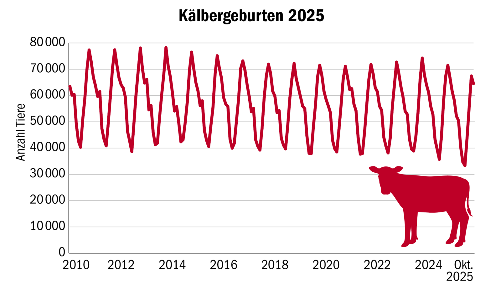 Während es aufgrund der Zuchtfortschritte und professioneller Betriebe bei den Schweinen ein wachsendes Angebot gibt, macht den Rindviehhaltern die Seuchenlage das Leben schwer. Dies zeigt sich auch in der Geburtsstatistik. Seit vergangenem Oktober wurden bei Identitas 635 880 Kälbergeburten gemeldet, das sind 28 416 weniger als in der gleichen Zeitperiode des Vorjahres. Beim Rindfleisch dürfte es also weiterhin knapp bleiben, beziehungsweise es findet eine Verlagerung vom Kalbfleisch hin zum Bankfleisch statt, wie die Schlachtzahlen von Proviande zeigen.
