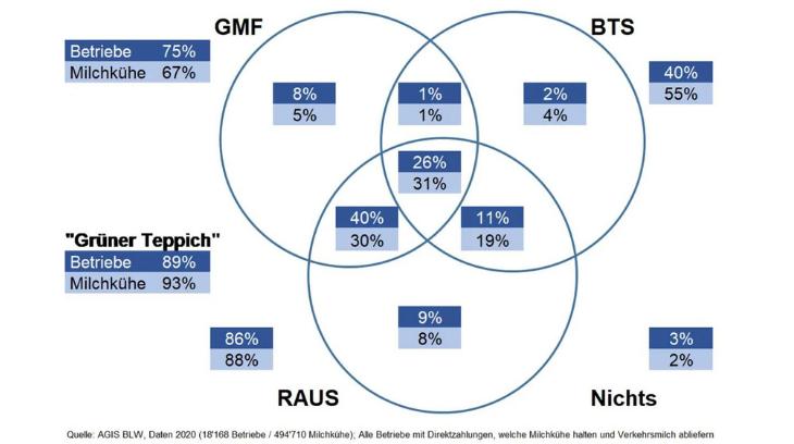 RAUS, BTS und GMF sind im Branchenstandard Swissmilk Green (»Grüner Teppich») enthalten. Nur drei Prozent der Milchvieh-Betriebe in der Schweiz nehmen an keinem der Tierwohl-Programme teil. (Grafik SMP)