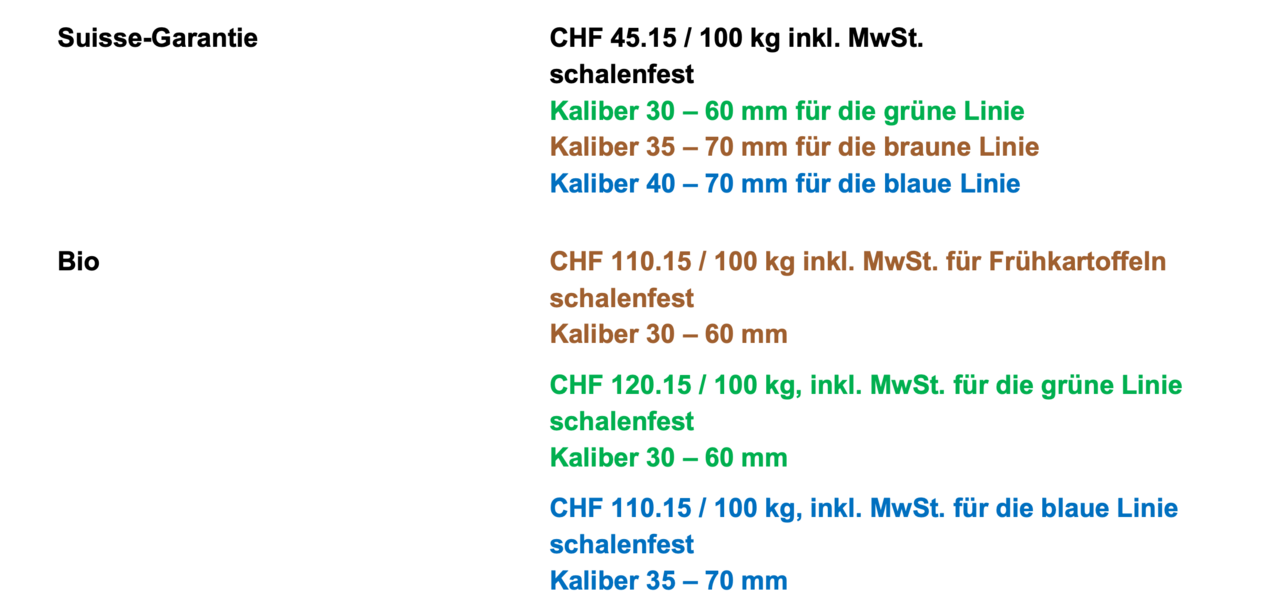 Das Angebot an frühen Kartoffeln sei nach wie vor gut. Der grösste Teil der gedeckten Frühkartoffeln sei geerntet und die Ernte der Freilandware laufe bereits. Der Absatz sei aufgrund der Sommerferien und der heissen Witterung weiterhin schleppend, so die Branchenorganisation. Die Qualität der Ware sei hingegen erfreulich. Für die mehligkochenden Kartoffeln (blaue Linie) wird das Kaliber bei Suisse Garantie auf 40–70 mm und bei Bio auf 35–70 mm angepasst. Die übrigen Kaliber bleiben gleich.
