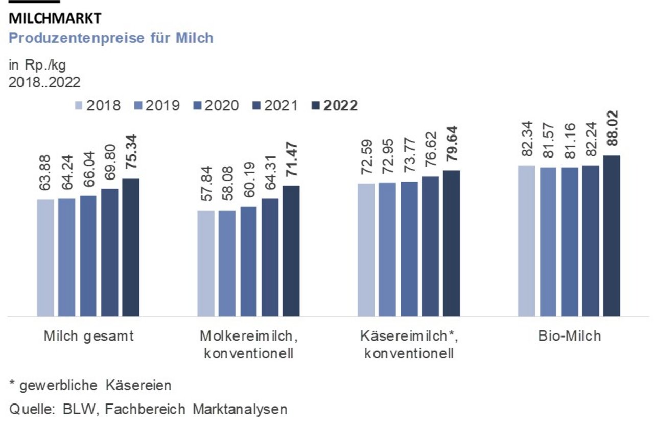 Im Jahr 2022 erhöhte sich der Produzentenpreis für Milch gegenüber dem Vorjahr um 7,9 Prozent auf 75.34 Rappen pro Kilogramm, wie das Bundesamt für Landwirtschaft (BLW) im Marktbericht Milch bekannt gibt. Das sei der höchste Stand seit 2009.