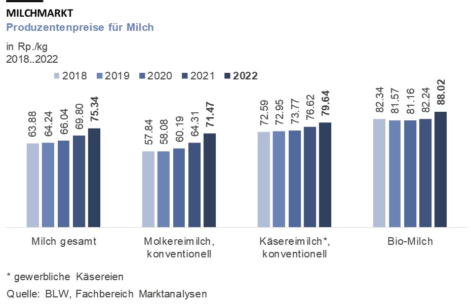 Seit 2017 habe der Produzentenpreis für Milch einen kontinuierlichen Zuwachs verzeichnet und habe 2022 schliesslich 75.34 Rp./kg erreicht, was 5.54 Rp./kg mehr sind als 2021. Mit einem Plus von 7,9 Prozent handle es sich um den stärksten Anstieg der letzten sechs Jahre.[IMG 2]