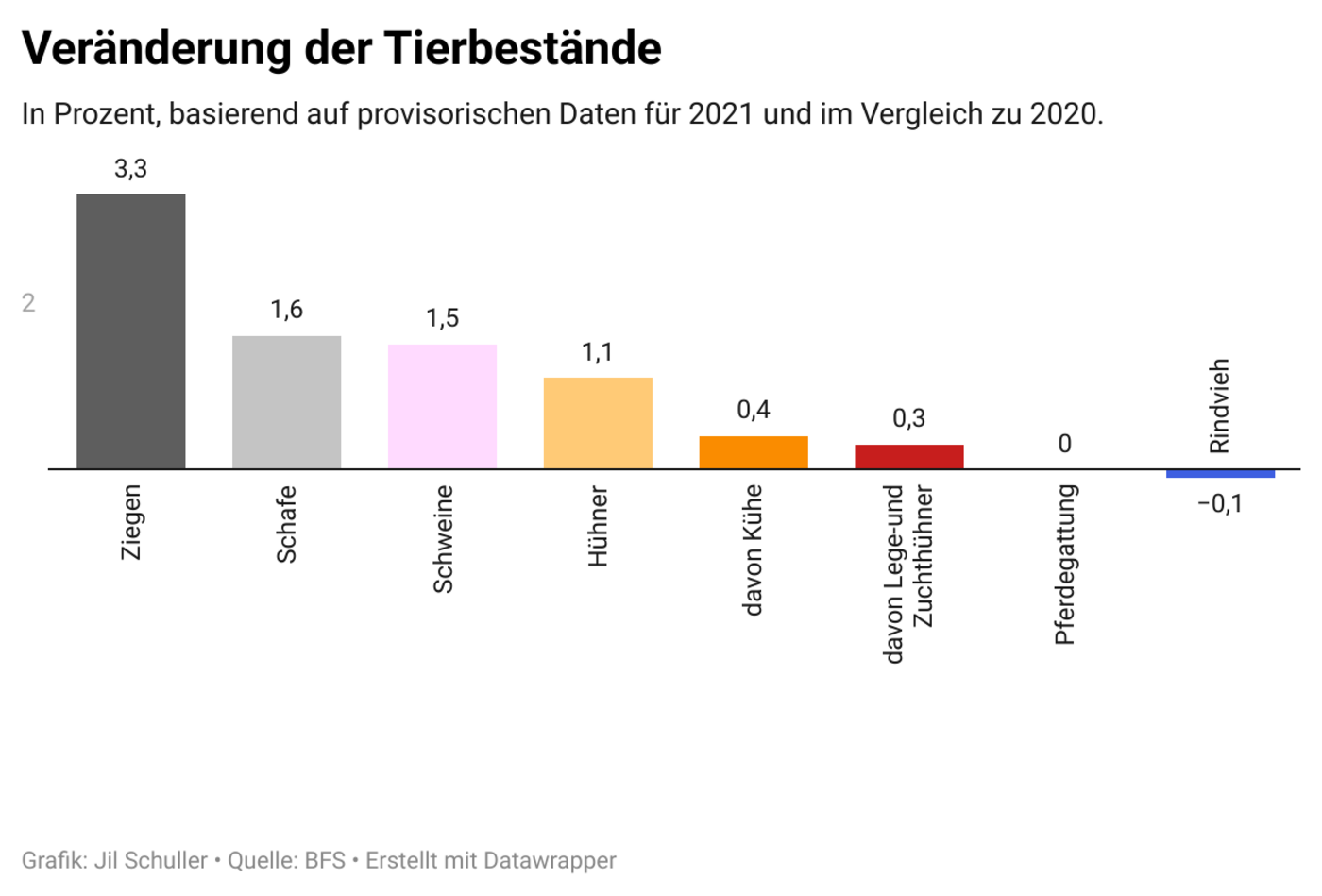 Ziegen scheinen sich steigender Beliebtheit zu erfreuen, jedenfalls nahm ihr Bestand in der Schweiz von 2020 bis 2021 um 2'622 Stück oder 3,3 Prozent zu. Ziegenprodukte, insbesondere Ziegenkäse, erwies sich in den letzten Jahren als Wachstumsmarkt. Ein Wachstum verzeichnet man auch bei der Gesamtzahl Schweine (+ 1,5 Prozent oder rund 19'900 Stück) und Schafe (+ 1,6 Prozent oder rund 5'600 Stück). Bei den Schweinen haben die guten Preise der vergangenen Jahre 2021 bei Jagern und Mastschweinen zu einem Überangebot geführt. Schaf- und Lammfleisch ist heute eine Nische, der aber grosses Potential zugesprochen wird. Mit 3'867'071 Tieren erreicht der Bestand an Legehe- und Zuchthühnern einen neuen Rekordwert. Seit Jahren floriert der Eiermarkt, es wird aber noch immer auch einiges importiert.