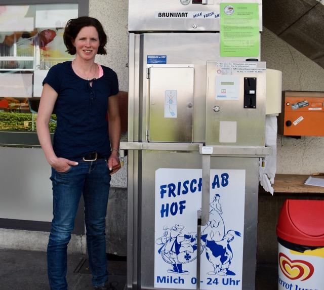 Ihre Eltern haben dann vor 20 Jahren einen Milchautomaten gekauft. Dieser steht in Steffisburg vor der Bäckerei Galli. Es ist ein Bruni-mat, wobei man seine Flasche oder Milchkesseli hinstellt und soviel Milch erhält, wie man Münzen dafür eingeworfen hat.