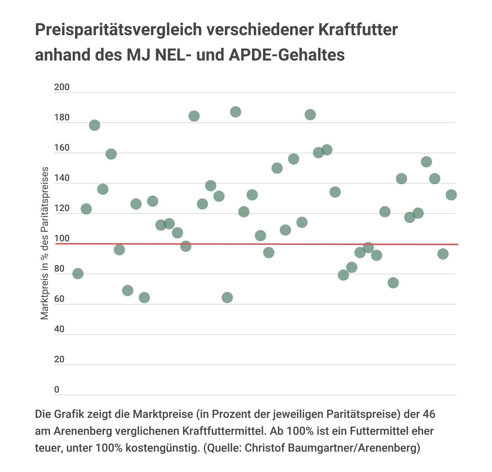 Nun gibt es verschiedene Einwände. Erstens hat Christof Baumgartner zur Berechnung der Futtermittel die Preise von Sojaschrot und Gerste als Referenz angenommen. Je nach Komponenten können einzelne Futtermittel bereits dadurch etwas teurer werden.