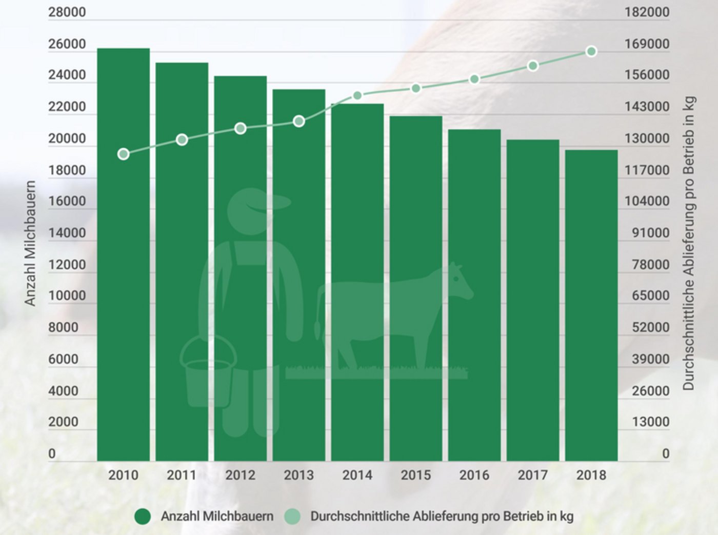 Der Strukturwandel zeigt sich in der Milchbranche sehr deutlich. Dass weniger Bäuerinnen und Bauern Milch produzieren heisst nicht, dass insgesamt im gleichen Masse weniger Milch produziert wird. Denn im selben Zeitraum hat die abgelieferte Milch pro Betrieb um rund ein Drittel von 127'000 Kilo pro Jahr auf 169'000 zugenommen. Die gemolkene Kuhmilch lag 2010 bei insgesamt 4,1 Millionen Tonnen, im letzten Jahr bei 3,95 Millionen.