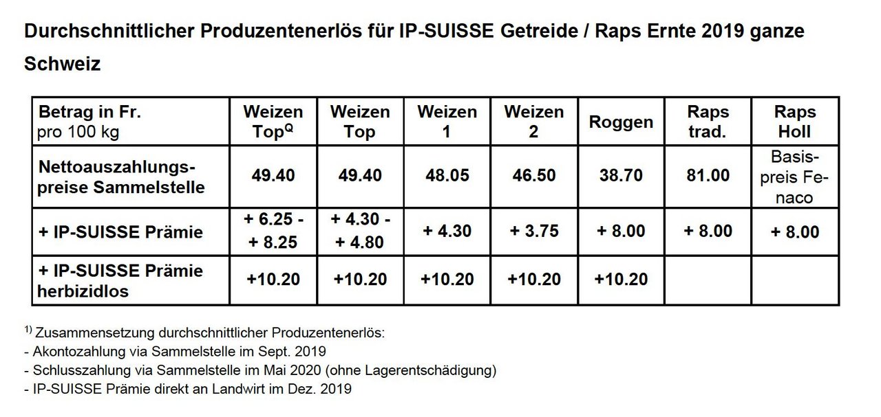 Bei den in der obigen Tabelle kommunzierten Preisen für IPS-Getreide und -Raps handle es sich um gesamtschweizerische Durchschnittspreise, schreibt IP-Suisse weiter. Es gebe viele Faktoren, die die Preise für die unterschiedlichen Sammelstellen beeinflussten. Insbesondere die Nähe zu einer Mühle, die Qualität des Weizens, der Zeitraum der Vermarktung, die Struktur und Ausstattung der Sammelstelle.