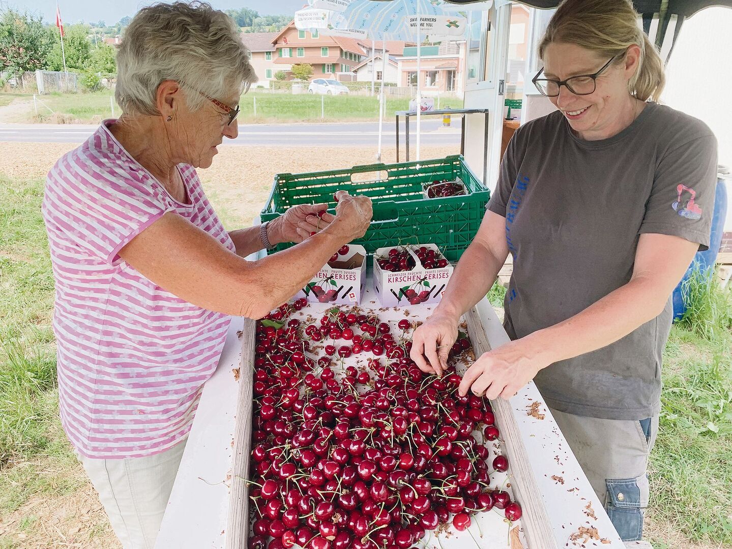 Gross, knackig, frisch und aromatisch sollen sie sein. Solche Kirschen sind derzeit beim Kreisel in Gelfingen im Luzerner Seetal zu haben. Dort verkaufen Mutter Marlis und Tochter Jolanda Trösch, die Partnerin von Betriebsleiter Jakob Müller, die baumfrischen Früchte an Lauf- und viele Stammkunden an der rege befahrenen Strasse. Der Verkaufsstand ist bedient, da muss was gehen während den Öffnungszeiten von Montag…