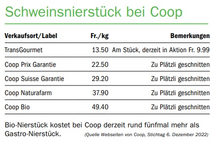 Mit seiner jüngsten Studie hat der Schweizer Tierschutz erneut die hohen Labelmargen im Detailhandel kritisiert, diesmal u. a. mit Fokus Schweinefleisch. Aus diesem Anlass werfen wir einen Blick auf die Preispolitik von Coop beim Schweinsnierstück. Die Tabelle zeigt, dass hier sehr grosse Unterschiede bestehen. Coop wurde deshalb ausgewählt, weil die Firma mit Transgourmet einen Gastrodistributor hat.[REL 1] «Gross-…