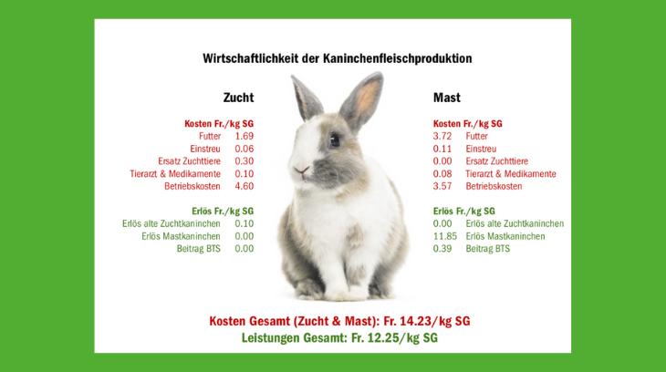 2019 wurden in der Schweiz etwa 588 Tonnen Kaninchenfleisch produziert. In den letzten Jahren stabilisierte sich der Bestand an Zucht- und Mastkaninchen auf 60 000 Tiere. 2020 wurde allerdings eine Bestandsreduzierung von 11,7% beobachtet. Aktuell liegt der Schweizer Kaninchenbestand bei 54 084 Tieren. Eine aktuelle Berechnung der Wirtschaftlichkeit der Kaninchenfleischproduktion durch die Forschungsanstalt Agroscope ergab Gesamtkosten von Fr. 14,23 pro Kilogramm Schlachtgewicht (kg SG). Die Leistungen pro kg SG lagen bei Fr. 12,25 . Der Verlust von Fr. 2.– wurde darauf zurückgeführt, dass der in der Berechnung verwendete Stundenlohn von Fr. 28.– nicht erreicht wird.