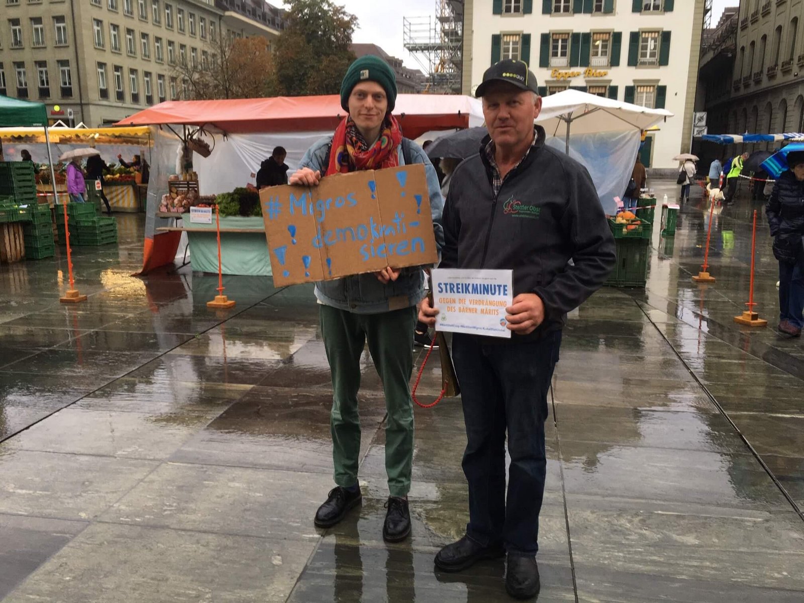 Julian Seiler vom Klimastreik und Walter Stettler, Präsident des Berner Märits haben dieselben Anliegen: Eine nachhaltige und klimaschonende Landwirtschaft. Kurze Transportwege dank regionaler Märkte gehören da dazu. (Bild jsc)